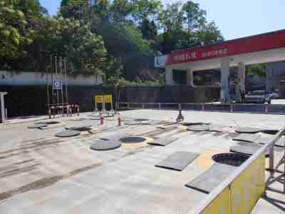 加油區(qū)設(shè)置加油罩棚,罩棚為混凝土框架結(jié)構(gòu)罩棚。罩棚下設(shè)置4臺(tái)雙油品雙槍自吸式加油機(jī)(汽油加油槍帶油氣回收);埋地油罐區(qū)設(shè)有4只30m³埋地臥式單層鋼制油罐(油罐均為車道罐,設(shè)置在承重防滲罐池內(nèi)),其中2只30m³汽油罐(分別儲(chǔ)存92#汽油和95#汽油),2只30m³柴油罐(儲(chǔ)存0#柴油),折合油罐總?cè)莘e為90m³(柴油罐容積折半計(jì)入),根據(jù)《汽車加油加氣加氫站技術(shù)標(biāo)準(zhǔn)》GB50156-2021的相關(guān)規(guī)定,該加油站為三級(jí)加油站。