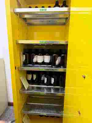 公司在實驗室做化驗實驗中需使用到易制毒、易制爆化學(xué)品:鹽酸、高錳酸鉀、硫酸、硝酸鉀、硝酸鉛、硝酸、雙氧水等,以上危險化學(xué)品包裝均采用試劑瓶的形式儲存在危險化學(xué)品中間倉庫內(nèi)。除此之外,危險化學(xué)品中間倉庫內(nèi)還涉及乙醇[無水]、乙醇溶液(95%)、乙腈、甲醇等危險化學(xué)品的儲存。